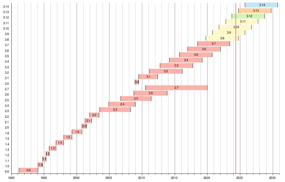 | 3.13 | 3.13.0b1[68][69] | 2024-10-01[68] | 2026-05[68] | 2029-10[68] |