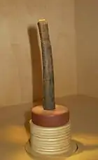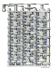 Gottfried Wilhelm von Leibniz invented the stepped reckoner and his famous stepped drum mechanism around 1672. He attempted to create a machine that could be used not only for addition and subtraction but would use a moveable carriage to enable multiplication and division. Leibniz once said "It is unworthy of excellent men to lose hours like slaves in the labour of calculation which could safely be relegated to anyone else if machines were used."[22] However, Leibniz did not incorporate a fully successful carry mechanism. Leibniz also described the binary numeral system,[23] a central ingredient of all modern computers. However, up to the 1940s, many subsequent designs (including Charles Babbage's machines of 1822 and even ENIAC of 1945) were based on the decimal system.[lower-alpha 6]