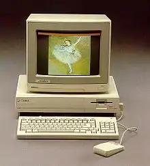 The company demonstrated a prototype at the January 1984 Consumer Electronics Show (CES) in Chicago, attempting to attract investors.[6][7] The Sage acted as the CPU, and BYTE described "big steel boxes" substituting for the chipset that did not yet exist.[8] The magazine reported in April 1984 that Amiga Corporation "is developing a 68000-based home computer with a custom graphics processor. With 128K bytes of RAM and a floppy-disk drive, the computer will reportedly sell for less than $1000 late this year."[9]