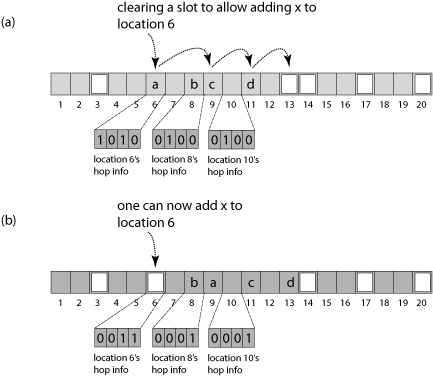 - If the hop-information word for bucket i shows there are already H items in this bucket, the table is full; expand the hash table and try again.