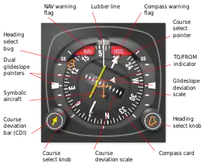 The horizontal situation indicator (commonly called the HSI) is an aircraft flight instrument normally mounted below the artificial horizon in place of a conventional heading indicator. It combines a heading indicator with a VHF omnidirectional range-instrument landing system (VOR-ILS) display.[1] This reduces pilot workload by lessening the number of elements in the pilot's instrument scan to the six basic flight instruments. Among other advantages, the HSI offers freedom from the confusion of reverse sensing on an instrument landing system localizer back course approach. As long as the needle is set to the localizer front course, the instrument will indicate whether to fly left or right, in either direction of travel.