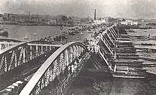 Eventually a contract was signed with Sir Bradford Leslie to construct a pontoon bridge. Different parts of the bridge were constructed in England and shipped to Calcutta, where they were assembled. The assembling period was fraught with problems. The bridge was considerably damaged by the great cyclone on 20 March 1874.[8] A steamer named Egeria broke from her moorings and collided head-on with the bridge, sinking three pontoons and damaging nearly 200 feet of the bridge.[8] The bridge was complete in 1874,[9] at a total cost of ₹2.2 million,[17] and opened to traffic on 17 October of that year.[8] The bridge was then 1528 ft long and 62 ft wide, with 7-foot wide pavements on either side.[9] Initially the bridge was periodically unfastened to allow steamers and other marine vehicles to pass through. Before 1906, the bridge used to be undone for the passage of vessels during daytime only. Since June of that year it started opening at night for all vessels except ocean steamers, which were required to pass through during daytime.[17] From 19 August 1879, the bridge was illuminated by electric lamp-posts, powered by the dynamo at the Mullick Ghat Pumping Station.[9] As the bridge could not handle the rapidly increasing load, the Port Commissioners started planning in 1905 for a new improved bridge.