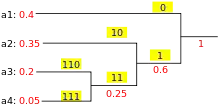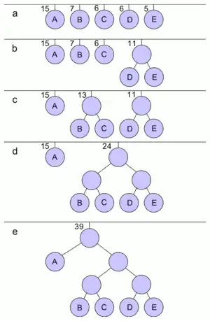 - Create a new internal node with these two nodes as children and with probability equal to the sum of the two nodes' probabilities.