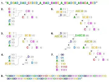 BED". In steps 2 to 6, the letters are sorted by increasing frequency, and the least frequent two at each step are combined and reinserted into the list, and a partial tree is constructed. The final tree in step 6 is traversed to generate the dictionary in step 7. Step 8 uses it to encode the message.
