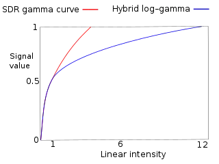 The hybrid log–gamma (HLG) transfer function is a transfer function jointly developed by the BBC and NHK for high dynamic range (HDR) display.[1] It's backward compatible with the transfer function of SDR (the gamma curve).[2] It was approved as ARIB STD-B67 by the Association of Radio Industries and Businesses (ARIB).[1][3][4] It is also defined in ATSC 3.0, Digital Video Broadcasting (DVB) UHD-1 Phase 2, and International Telecommunication Union (ITU) Rec. 2100.[5][6][7]