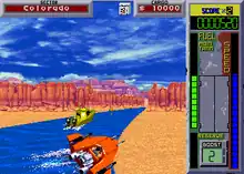 In Hydra, thieves are trying to steal the treasures from a museum. These artifacts contain secrets to a weapon, and it is up to you to stop them. The player is issued an experimental speedboat to navigate the rivers in order to retrieve the treasures from checkpoints.[2] There are nine levels of rivers and oceans, while playing the game the player can collect money bags for extra cash and crystals for extra fuel.[3] The obstacles are gun embankments, enemy crafts and other nuisances which will slow you down and you can loose your cargo which will float down stream that you will have to go and collect.[4][3] At the end of each level the player then drops off the cargo and can then buy upgrades from a shop to improve the Hydra speedboat.[5]