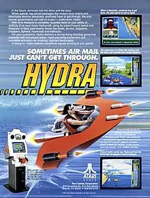 Hydra is a 1990 arcade vehicular combat video game developed and published by Atari Games. In Hydra, the player pilots a hovercraft, trying to deliver top secret items while avoiding mines, other hovercraft, and logs. The player can collect money and fuel to continue. X-Y yoke control.