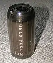 The Mass Storage System consisted of a library of cylindrical plastic cartridges, two inches wide and 4 inches (100 mm) long, each holding a spool of tape 770 inches (20 m) long storing 50 MB; each virtual disk required a pair of cartridges. These cartridges were held in a hexagonal array of bins in the IBM 3851 Mass Storage Facility. New cartridges were rolled into the facility and were automatically stored in a vacant bin. The data were accessed via virtual IBM 3330 disk drives, and physically cached on a combination of 3330 and 3350[lower-alpha 1] staging drives, the data being transferred automatically between cartridge and disk drive in processes called staging and destaging. These were all connected together with the IBM 3830 Storage Control (also used for disk storage alone), the entire system making up a 3850 unit.