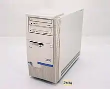 ![]() An IBM Aptiva desktop unit from 1995. Pressing the top left corner of the front panel will open it to reveal the removable disk drives. | |