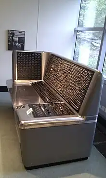 The SSEC was an unusual hybrid of vacuum tubes and electromechanical relays. Approximately 12,500 vacuum tubes were used in the arithmetic unit, control, and its eight (relatively high-speed) registers, which had an access time of less than one millisecond. About 21,400 relays were used for control and 150 lower-speed registers, with an access time of 20 milliseconds. The relay technology was similar to the ASCC, based on technology invented by Clair D. Lake (1888–1958).[13] The arithmetic logic unit of the SSEC was a modified IBM 603 electronic multiplier, which had been designed by James W. Bryce.[14] The bulky tubes were military surplus radar technology, which filled one entire wall. The memory was organized as signed 19-digit decimal numbers. Multiplication was computed with 14 digits in each factor. Most of the quoted 400,000 digit capacity was in the form of reels of punched paper tape.[15]