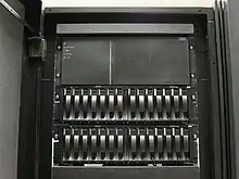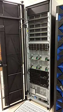 The IBM XIV Storage System was configured as cabinet-size solution and designed to work well in cloud and virtualized environments. The last XIV Gen3 model offers 2, 3, 4 or 6 TB drives, providing up to 485 TB of usable capacity per rack. SSD caching (available as an option) adds up to 12 TB of management-free high-performance data caching capability to the entire array. The system can also connect to external storage via Fibre Channel (8 Gbit/s) and iSCSi (1 or 10 Gbit/s).[25] The XIV line was replaced by IBM FlashSystem line.[26]