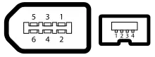 The 6-conductor powered connector, now referred to as an alpha connector, adds power output to support external devices. Typically a device can pull about 7 to 8 watts from the port; however, the voltage varies significantly from different devices.[24] Voltage is specified as unregulated and should nominally be about 25 volts (range 24 to 30). Apple's implementation on laptops is typically related to battery power and can be as low as 9 V.[24]