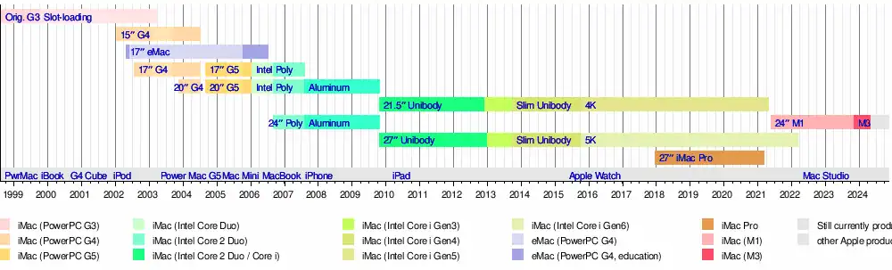 | Timeline of iMac and eMac models (sorted by screen sizes) |