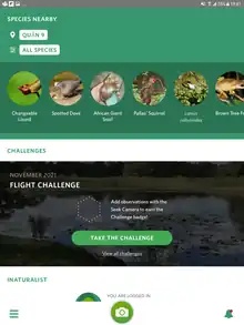 Seek by iNaturalist, a separate app marketed to families, requires no online account registration and all observations may remain private.[26] Seek incorporates features of gamification, such as providing a list of nearby organisms to find and encouraging the collection of badges and participation in challenges.[27] Seek was initially released in the spring of 2018.[26]