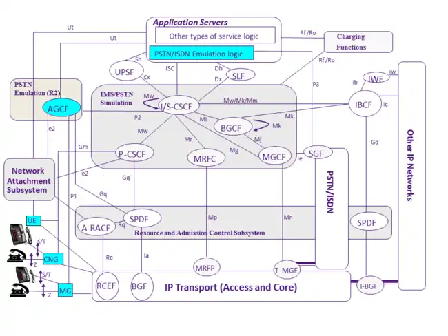- 3GPP release 7 added support for fixed networks by working together with TISPAN release R1.1, the function of AGCF (access gateway control function) and PES (PSTN emulation service) are introduced to the wire-line network for the sake of inheritance of services which can be provided in PSTN network. AGCF works as a bridge interconnecting the IMS networks and the Megaco/H.248 networks. Megaco/H.248 networks offers the possibility to connect terminals of the old legacy networks to the new generation of networks based on IP networks. AGCF acts a SIP User agent towards the IMS and performs the role of P-CSCF. SIP User Agent functionality is included in the AGCF, and not on the customer device but in the network itself. Also added voice call continuity between circuit switching and packet switching domain (VCC), fixed broadband connection to the IMS, interworking with non-IMS networks, policy and charging control (PCC), emergency sessions. It also added SMS over IP.[5]