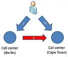 IP shuffling is particularly useful in a multi call center environment. In this example, the customer establishes a call to a call center in Berlin, Germany.