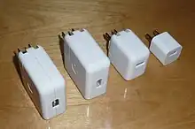 Four iPod wall chargers for North America, all made by Apple. These have FireWire (left) and USB (right three) connectors, which allow iPods to charge without a computer. The unit second-to-left appears to be a model number A1102 unit. The units have been miniaturized over time.