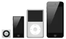 Various iPod models. From left to right: iPod 5th generation in a case, iPod 4th generation, iPod Mini, iPod Nano, iPod Shuffle