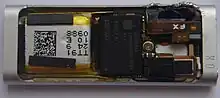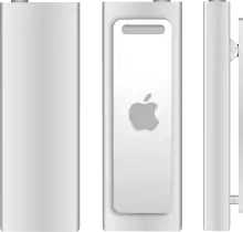 The third-generation iPod Shuffle featured a polished steel attachment clip, adopting for the first time the polished steel finishing previously found only on the larger iPods, rather than the brushed aluminum used in the second-generation iPod Shuffle. It also no longer had volume or track controls on the device itself. Instead, the packaged iPod earbuds included a three-button device on the right earbud cord. This added the functions of changing between playlists, hearing the song title and artist of the track playing, as well as play/pause, track changes and volume control.[16] It originally was not possible to change songs or volume with most third-party headphones, since they lacked these controls. However, since the device began playing music automatically when it was turned on, third-party headphones could still be used in "autoplay" mode (with no volume or playback controls), and after its release, some third-party headphones and headphone adapters began to include full support for the third generation.[17] The official headphones contained a chip designed by Apple to control the device. DRM is not however present in the chip as there is no encryption used.[18]