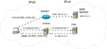 DNS64 describes a DNS server that when asked for a domain's AAAA records, but only finds A records, synthesizes the AAAA records from the A records. The first part of the synthesized IPv6 address points to an IPv6/IPv4 translator and the second part embeds the IPv4 address from the A record. The translator in question is usually a NAT64 server. The standard-track specification of DNS64 is in RFC 6147.[12]