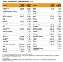 The United-States, with 3.9 million registered ISBNs in 2020, was by far the biggest user of the ISBN identifier in 2020, followed by the Republic of Korea (329,582), Germany (284,000), China (263,066), the UK (188,553) and Indonesia (144,793). Lifetime ISBNs registered in the United States are over 39 million as of 2020.[15]