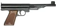 The pistols used are gas-driven with a caliber of 4.5 mm (.177 in). The minimum trigger pull weight is 500 gram (17.6 oz), half that of a sport pistol, and the grip restrictions are similar to sport pistols, but the box in which an air pistol must fit is larger: 42 by 20 by 5 cm (17 by 8 by 2 in).[15] This allows for longer sight lines and also gives room for cocking arms, although with a few exceptions (such as the Baikal IZH-46M) modern match air pistols use pre-filled air, or less commonly carbon dioxide, containers.[16] The maximum overall weight is 1.5 kg (3.31 lb). The pistol must be operated by only one hand from a standing position, and may only be loaded with one pellet at a time.[17]