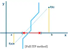 In numerical analysis, the ITP method, short for Interpolate Truncate and Project, is the first root-finding algorithm that achieves the superlinear convergence of the secant method[1] while retaining the optimal[2] worst-case performance of the bisection method.[3] It is also the first method with guaranteed average performance strictly better than the bisection method under any continuous distribution.[3] In practice it performs better than traditional interpolation and hybrid based strategies (Brent's Method, Ridders, Illinois), since it not only converges super-linearly over well behaved functions but also guarantees fast performance under ill-behaved functions where interpolations fail.[3]