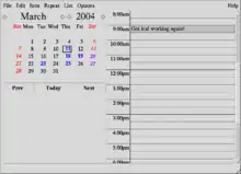 ical is a calendar package written in Tcl/Tk by Sanjay Ghemawat for Unix systems. ical is known for its simple, intuitive interface. It's possible for Tcl/Tk programmers to extend ical with custom functionality. It stores all calendaring information in a single flat text file per user that may be easily parsed by other programs. ical is free software released under the GNU General Public License.