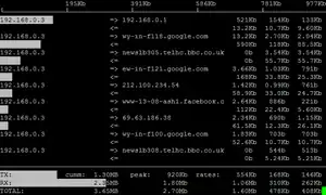 Iftop is a free software command-line system monitor tool developed by Paul Warren. It produces a real-time stream of incoming and outgoing network communications from the operating system iftop is running within.[2] By default, the connections are ordered by bandwidth usage, with only the largest ("top") bandwidth consumers shown. It is analogous to top, but instead of system-wide resource monitoring, it focuses on displaying just network usage. Iftop is typically used for monitoring bandwidth consumption, and while investigating unknown consumers of available network bandwidth.