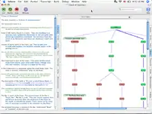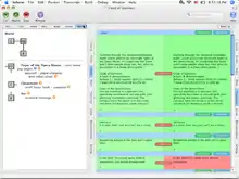 The IDE presents two side-by-side panes for working in. Each pane can contain the source code being worked on, the current status of compilation, the skein, the transcript, the indices of the source code, a running version of the game, documentation for Inform 7 or any installed extensions to it, or settings. The concept is to imitate an author's manuscript book by presenting two "facing pages" instead of a multitude of separate windows.[13]