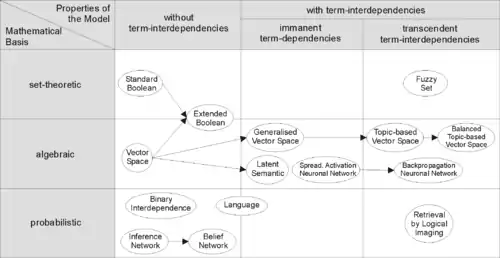 In order to effectively retrieve relevant documents by IR strategies, the documents are typically transformed into a suitable representation. Each retrieval strategy incorporates a specific model for its document representation purposes. The picture on the right illustrates the relationship of some common models. In the picture, the models are categorized according to two dimensions: the mathematical basis and the properties of the model.