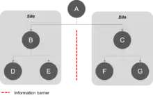 In understanding organizational behaviour, the term silo mentality[2] often refers to a mindset which creates and maintains information silos within an organization. A silo mentality is created by the divergent goals of different organizational units: it is defined by the Business Dictionary as "a mindset present when certain departments or sectors do not wish to share information with others in the same company".[3] It can also be described as a variant of the principal–agent problem.
