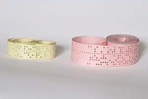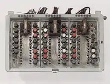 Early electronic computers such as Colossus made use of punched tape, a long strip of paper on which data was represented by a series of holes, a technology now obsolete.[21] Electronic data storage, which is used in modern computers, dates from World War II, when a form of delay-line memory was developed to remove the clutter from radar signals, the first practical application of which was the mercury delay line.[22] The first random-access digital storage device was the Williams tube, which was based on a standard cathode ray tube.[23] However, the information stored in it and delay-line memory was volatile in the fact that it had to be continuously refreshed, and thus was lost once power was removed. The earliest form of non-volatile computer storage was the magnetic drum, invented in 1932[24] and used in the Ferranti Mark 1, the world's first commercially available general-purpose electronic computer.[25]