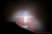 ILS uses two directional radio signals, the localizer (108 to 112 MHz frequency), which provides horizontal guidance, and the glideslope (329.15 to 335 MHz frequency) for vertical guidance. The relationship between the aircraft's position and these signals is displayed on an aircraft instrument, often additional pointers in the attitude indicator. The pilot attempts to manoeuvre the aircraft to keep the indicators centered while they approach the runway to the decision height. Optional marker beacon(s) provide distance information as the approach proceeds, including the middle marker (MM), placed close to the position of the (CAT 1) decision height. Markers are largely being phased out and replaced by distance measuring equipment (DME). The ILS usually includes high-intensity lighting at the end of the runways to help the pilot locate the runway and transition from the approach to a visual landing.[1]
