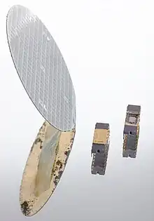 The 8008 was implemented in 10 μm silicon-gate enhancement-mode PMOS logic. Initial versions could work at clock frequencies up to 0.5 MHz. This was later increased in the 8008-1 to a specified maximum of 0.8 MHz. Instructions take between 5 and 11 T-states, where each T-state is 2 clock cycles.[11] Register–register loads and ALU operations take 5T (20 μs at 0.5 MHz), register–memory 8T (32 μs), while calls and jumps (when taken) take 11 T-states (44 μs).[12] The 8008 is a little slower in terms of instructions per second (36,000 to 80,000 at 0.8 MHz) than the 4-bit Intel 4004 and Intel 4040.[13] but since the 8008 processes data 8 bits at a time and can access significantly more RAM, in most applications it has a significant speed advantage over these processors. The 8008 has 3,500 transistors.[14][15][16]