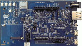 The Intel Edison is a computer-on-module that was offered by Intel as a development system for wearable devices[2] and Internet of Things devices. The system was initially announced to be the same size and shape as an SD card and containing a dual-core Intel Quark x86[3] CPU at 400 MHz communicating via Bluetooth and Wi-Fi.[4][5] A later announcement changed the CPU to a 500 MHz Silvermont dual-core Intel Atom CPU,[6] and in September 2014 a second version of Edison was shown at IDF, which was bigger and thicker than a standard SD card.[7][8][9]