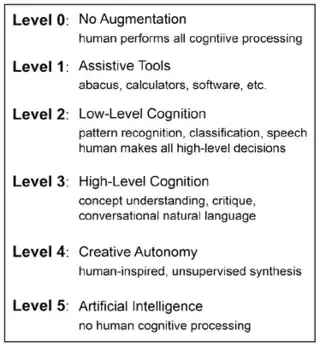 Ron Fulbright describes human cognitive augmentation in human/cog ensembles involving humans working in collaborative partnership with cognitive systems (called cogs). By working together, human/cog ensembles achieve results superior to those obtained by the humans working alone or the cognitive systems working alone. The human component of the ensemble is therefore cognitively augmented. The degree of augmentation depends on the proportion of the total amount of cognition done by the human and that done by the cog. Six Levels of Cognitive Augmentation have been identified: [14][15]
