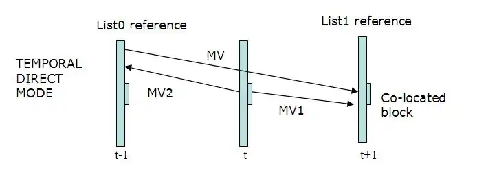 - It uses the block motion vector from List 1 frame, located at the same position to deduce the motion vector. List 1 block uses a List 0 block as reference.