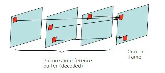 Multiple references to motion estimation allows finding the best reference in 2 possible buffers (List 0 to past pictures, List 1 to future pictures) which contain up to 16 frames in total.[4][5] Block prediction is done by a weighted sum of blocks from the reference picture. It allows enhanced picture quality in scenes where there are changes of plane, zoom, or when new objects are revealed.