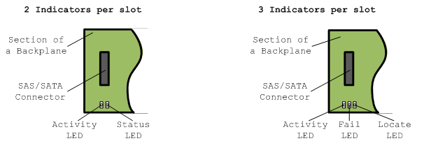 States for drives or slots can be, for example, empty, failed, rebuilding, etc. The state of a drive or slot is determined by the host bus adapter, and is typically transmitted to the backplane through SGPIO-signals on a cable.