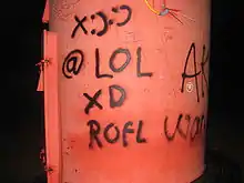 Internet slang (also called Internet shorthand, cyber-slang, netspeak, digispeak or chatspeak) is a non-standard or unofficial form of language used by people on the Internet to communicate to one another.[1] An example of Internet slang is "LOL" meaning "laugh out loud." Since Internet slang is constantly changing, it is difficult to provide a standardized definition.[2] However, it can be understood to be any type of slang that Internet users have popularized, and in many cases, have coined. Such terms often originate with the purpose of saving keystrokes or to compensate for small character limits. Many people use the same abbreviations in texting, instant messaging, and social networking websites. Acronyms, keyboard symbols, and abbreviations are common types of Internet slang. New dialects of slang, such as leet or Lolspeak, develop as ingroup Internet memes rather than time savers. Many people also use Internet slang in face-to-face, real life communication.