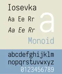 Iosevka (IPA: [ˌjɔˈseβ.kʰa])[2] is a monospace programming typeface, built declaratively using custom typeface generation software, and with an emphasis on compatibility with CJK characters.[3] It is available under a FOSS license. The default builds are available in two styles of nine weights each, and come with italic and oblique versions. The typeface was designed to be easily configurable by editing textual TOML configuration files in the custom generation software.