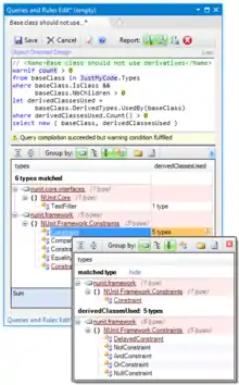 The tool proposes live code query and code rule through LINQ query. This is one of the innovations of JArchitect. For example: