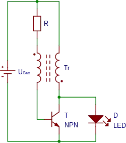The circuit works by rapidly switching the transistor. Initially, current begins to flow through the resistor, secondary winding, and base-emitter junction (see diagram) which causes the transistor to begin conducting collector current through the primary winding. Since the two windings are connected in opposing directions, this induces a voltage in the secondary winding which is positive (due to the winding polarity, see dot convention) which turns the transistor on with higher bias. This self-stroking/positive-feedback process almost instantly turns the transistor on as hard as possible (putting it in the saturation region), making the collector-emitter path look like essentially a closed switch (since VCE will be only about 0.1 volts, assuming that the base current is high enough). With the primary winding effectively across the battery, the current increases at a rate proportional to the supply voltage divided by the inductance. Transistor switch-off takes place by different mechanisms dependent upon supply voltage.