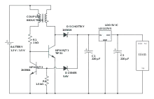 When a more constant output voltage is desired, the joule thief can be given a closed-loop control. In the example circuit, the Schottky diode D1 blocks the charge built up on capacitor C1 from flowing back to the switching transistor Q1 when it is turned on. A 5.6 Volt Zener diode D2 and transistor Q2 forms the feedback control: when the voltage across the capacitor C1 is higher than the threshold voltage formed by Zener voltage of D2 plus the base-emitter turn-on voltage of transistor Q2, transistor Q2 is turned on diverting the base current of the switching transistor Q1, impeding the oscillation and prevents the voltage across capacitor C1 from rising even further. When the voltage across C1 drops below the threshold voltage Q2 turns off, allowing the oscillation to happen again. This very simple circuit has the drawback of temperature-dependent output voltage due to BJT2 (Vbe), and a relatively high ripple, but can be filtered with a simple LC pi network with low losses. In the example circuit, is included a low dropout regulator which contributes to regulating further the output voltage and lowers the ripple, but has the penalty of low conversion efficiency