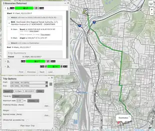 A public transport route planner is an intermodal journey planner, typically accessed via the web that provides information about available public transport services. The application prompts a user to input an origin and a destination, and then uses algorithms to find a good route between the two on public transit services. Time of travel may be constrained to either time of departure or arrival and other routing preferences may be specified as well.