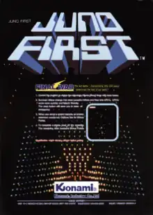 Juno First (ジュノファースト) is an arcade video game developed by Konami and released in 1983. It was licensed to Gottlieb in the United States. Juno First is a fixed shooter with a slightly tilted perspective, similar to Nintendo's Radar Scope from 1980.[1] The game was ported to the Commodore 64, Atari 8-bit computers, MSX, IBM PC, and IBM PCjr.