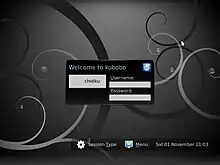 The default KDM login screen had a list of users. Each entry was comprised in the user's username, personal name (if available), and an icon. Next to the list is a greeting and a picture. One of the customization options is to replace the picture with an analog clock. From this screen the user can also run a user management tool, shut down or reboot the computer, or restart the X Window System.