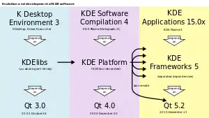 Platform releases are those which begin a series (version number X.0). Only these major releases are allowed to break binary compatibility with the predecessor. Releases in the minor series (X.1, X.2, ...) will guarantee binary portability (API & ABI). This means, for instance, that software that was developed for KDE 3.0 will work on all (future) KDE 3 releases; however, an application developed for KDE 2 is not guaranteed to be able to make use of the KDE 3 libraries. KDE major version numbers mainly follow the Qt release cycle, meaning that KDE SC 4 is based on Qt 4, while KDE 3 was based on Qt 3.