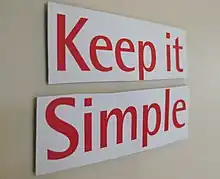 KISS, an acronym for "Keep it simple, stupid!", is a design principle first noted by the U.S. Navy in 1960.[1][2] First seen partly in American English by at least 1938, the KISS principle states that most systems work best if they are kept simple rather than made complicated; therefore, simplicity should be a key goal in design, and unnecessary complexity should be avoided. The phrase has been associated with aircraft engineer Kelly Johnson.[3] The term "KISS principle" was in popular use by 1970.[4] Variations on the phrase (usually as some euphemism for the more churlish "stupid") include "keep it super simple", "keep it simple, silly", "keep it short and simple", "keep it short and sweet", "keep it simple and straightforward",[5] "keep it small and simple", "keep it simple, soldier",[6] "keep it simple, sailor", "keep it simple, sweetie",[7] "keep it stupidly simple", or "keep it sweet and simple".